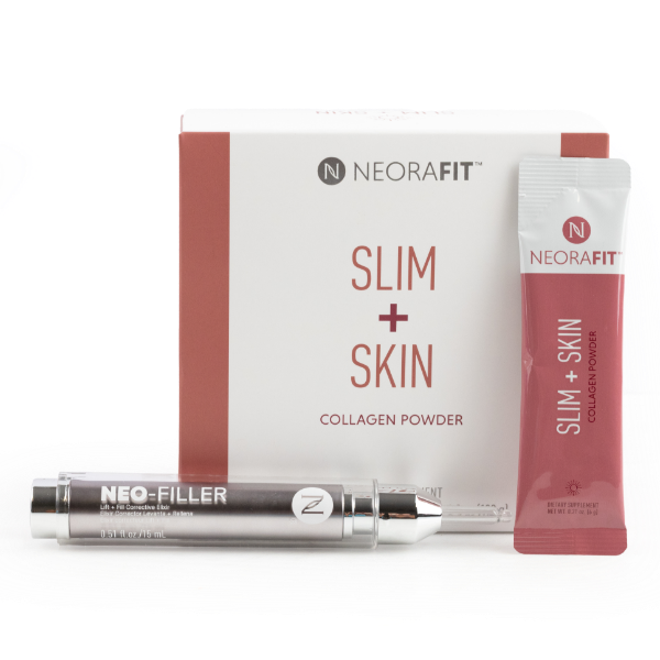 That's why we've paired Neo-FILLER Lift + Fill Corrective Elixir, our innovative topical filler that naturally plumps and smooths the look of skin, with Slim + Skin Collagen Powder, a powerful collagen-boosting supplement that works from within—a holistic solution that targets areas of concern and offers the most comprehensive approach in anti-aging technology.