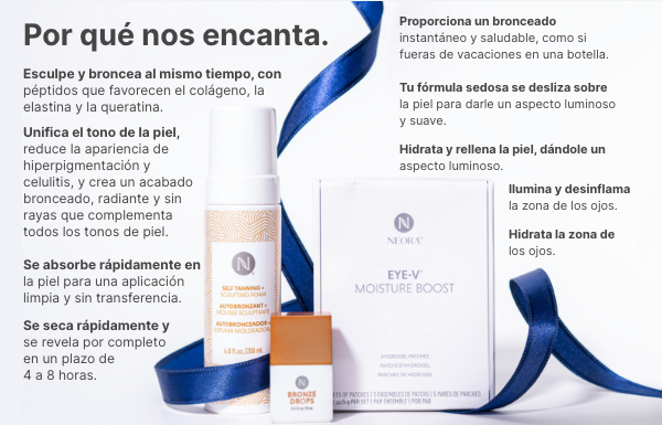 ¡Luce radiante antes de que caiga la bola! Responde a la llamada de las fiestas navideñas (y las selfies) con este trío potenciador del brillo que te proporciona el mejor resplandor de pies a cabeza hasta ahora, y de forma rápida. Nuestra espuma bronceadora y modeladora sin sol proporciona un bronceado natural y sin rayas, sin ensuciar, sin olores y sin daños por rayos UV. Las Bronze Drops añaden un toque sedoso de calidez instantánea y un brillo luminoso que favorece a todo tipo de tez (mézclalas con la crema de día para una aplicación más fácil que nunca). Juntas, proporcionan un brillo corporal completo que no pasa desapercibido. Y cuando las noches largas te pasen factura, los Parches ara ojos de hidrogel devuelven la vida a los ojos cansados con una suavidad luminosa e hidratada.